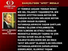 Rize'de de etkili yağışlar nedeniyle derelerin taştığını ve çok sayıda işyerinin sular altında kaldığını ifade eden Bahçeli, açıklamasında şunları belirtti: "Bölgenin bir an önce 'afet bölgesi' olarak ilan edilerek vatandaşlarımızın zararlarının giderilmesi, olumsuz yaşam şartlarının iyileştirilmesi ve gereken tedbirlerin alınması için hükümeti acilen göreve davet ediyorum.